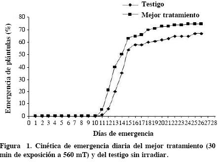 En general, las variables de respuesta presentaron un patrón de comportamiento parecido al alcanzar un valor máximo en comparación con el testigo con las dosis óptima de irradiación, para luego disminuir (Cuadro 4). Las cinéticas de emergencia de las plántulas, del mejor tratamiento y del testigo se muestran en la Figura 1, donde se compara el comportamiento al testigo con el mejor tratamiento.
