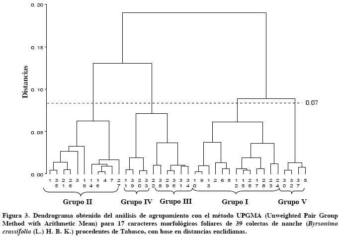 Según el análisis de componentes principales, los tres primeros explican 77.28 % de la variabilidad foliar en accesiones de nanche ubicadas en la Sierra de Tabasco, y a una distancia euclidiana de 0.07 conforman cinco grupos con características morfológicas de hoja similares. Los caracteres que mejor explican la variabilidad foliar fueron longitud del eje menor, índice de redondez, ángulo basal, ángulo de la quinta vena, relación longitud del eje mayor del limbo/longitud del eje menor, relación longitud del eje menor/longitud del pecíolo, y la relación ángulo basal/ángulo de la quinta vena.