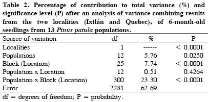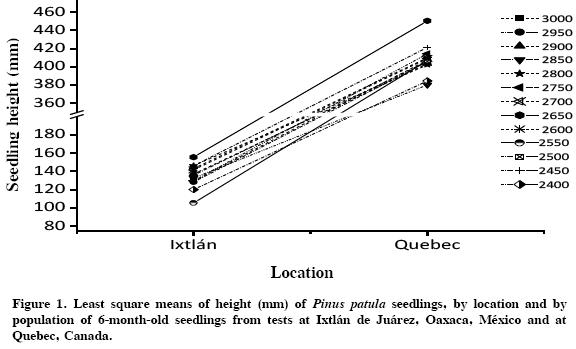 In order to determine whether there is genotype × environment interaction, a provenance test was established at two locations: (a) The forest nursery of the Native Indian Community of Ixtlán de Juárez (17° 19' 50" LN, 96° 29' 14" LW, 2030 masl, annual average temperature of 16.8 °C, and annual average precipitation of 964 mm), to which we will hereafter refer as "Ixtlán"; and (b) The research facilities of the Laurentian Forestry Centre of Natural Resources of Canada, Quebec City, Quebec, Canada (46° 47' LN, 71° 17' LW, 27 masl, annual average temperature of 5.0 °C, and annual average precipitation of 1173 mm), to which we will refer as "Quebec".