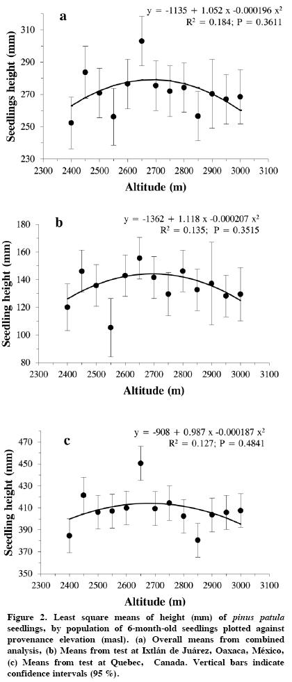 Regression analysis of overall population means against altitude of the provenances indicates that, although weak, there is a trend where populations originated at midaltitude have a slightly higher growth potential (expressed as larger total seedling height) than those populations originated from both altitudinal extremes (upper and lower). However, such trend was not found significant (quadratic model, R2 = 0.159; P = 0.421; Figure 2a). The pattern was not significant either (Ixtlán: R2 = 0.132; P = 0.492; Figure 1b; Quebec: R2 = 0.127; P = 0.508; Figure 2c) in the single site analysis.