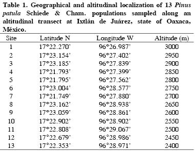 There are indications that P. patuía populations from lower altitudes grow more than populations from higher altitudes; however, those results come from studies where provenances of different altitudes came also from different latitudes (SalazarGarcía et al., 1999; Dvorak et al. , 2000), thus making difficult to establish clearly how much of the genetic variation among populations is associated with the altitudinal origin, because it would be needed to study several provenances from different altitudes and similar latitudes. An ongoing field test of the same set of P. patuía populations as those used in the present study, was recently established on two contrasting altitudes in the forest of Ixtlán de Juárez, Oaxaca. Hence, in a few years it will be possible to confirm whether population stability is maintained over time, and if the altitudinal pattern that was reported here would be expressed at later ages.