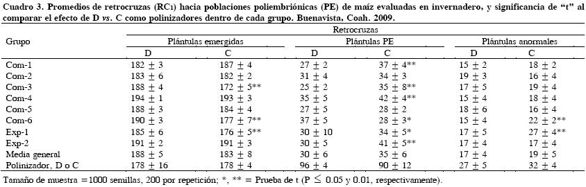 El análisis de varianza para FE, FPE y FPA, cuyos datos tuvieron transformación angular, se hizo con el paquete estadístico SAS (SAS Institute, 1999). La varianza de la fuente "cruzas" se partió en sus componentes: población C y población D, e incluyen el contraste D vs. C, con la finalidad de conocer el desempeño de C y D como polinizadores. La prueba de contrastes fue mediante una prueba de "t" (P < 0.01).