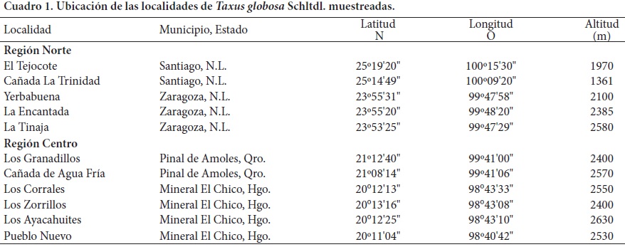 Taxus globosa Schltdl., comúnmente llamado tejo, romerillo o granadillo, es la única especie del género Taxus que se encuentra en México. La corteza y hojas de esta conifera contienen taxol (Shemluck et al., 2003), una sustancia útil en el tratamiento de varios tipos de cáncer (Barquero, 2007; Soto et al., 2000). El gobierno mexicano considera a T. globosa en la categoria de especie rara para su protección por lo restringido de su distribución natural (SEMARNAT, 2002). Habita en bosques mesófilo de montaña y de pino en zonas aisladas, barrancas húmedas y pendientes pronunciadas (Zavala, 2001), en los Estados de Nuevo León, Tamaulipas, San Luis Potosí, Querétaro, Hidalgo, Veracruz, Oaxaca y Chiapas en México; también se encuentra en Guatemala, El Salvador y Honduras (Zamudio, 1992; Shemluck et al., 2003). A pesar de su importancia ecológica y medicinal, existen pocos estudios de T. globosa en los que se aborden aspectos de demografía en una localidad (Zavala, 2002), contenido de taxol en corteza y hojas (Soto et al., 2000) o germinación de la semilla (Zavala, 2001; Nicholson y Munn, 2003). Se ha tratado infructuosamente de reproducirla por semilla (Zavala, 2001; Nicholson et al., 2003), y sólo se ha tenido éxito con métodos vegetativos (Muñoz et al., 2009).