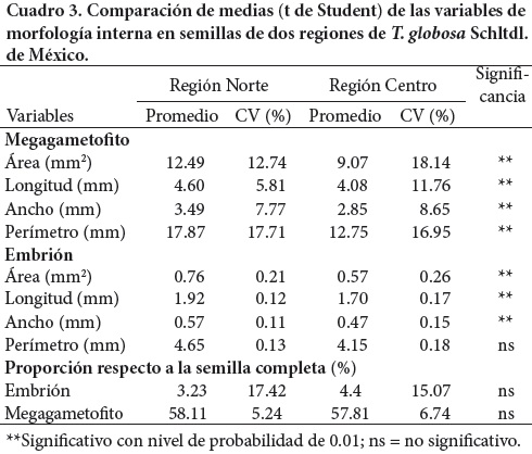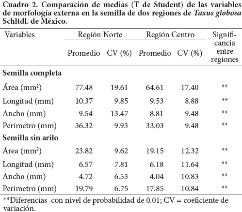 La semilla madura de T. globosa está cubierta por un arilo carnoso y mucilaginoso de color rojo (Figura 2), con una abertura en su parte inferior por la cual se puede ver la semilla; una vez retirado el arilo se observa a la semilla desnuda. Las imágenes obtenidas permitieron analizar las semillas de manera rápida y confiable, en las cuales se detectaron diferencias significativas entre regiones (Cuadro 2), ya que las provenientes de la región norte superaron (P ≤ 0.05) a las del centro, en todas las variables medidas, tanto en semillas con arilo como sin arilo. Estas diferencias se atribuyen al aislamiento geográfico que existe entre las poblaciones, que pudo haber ocasionado un proceso de diferenciación morfológica, como se ha demostrado en otras especies (MápulaLarreta et al., 2007; Mehes et al., 2009).