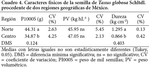 Las variables morfológicas y las características físicas analizadas de la semilla de Taxus globosa muestran diferencias significativas entre regiones geográficas, ya que las del norte de México son mayores que las del centro. Se postula que esta especie presenta un embrión subdesarrollado o latencia de tipo morfológico, que dificulta la germinación de la semilla. Las semillas provenientes de ambas regiones no requieren de escarificación, ya que no poseen una testa dura impermeable al agua.