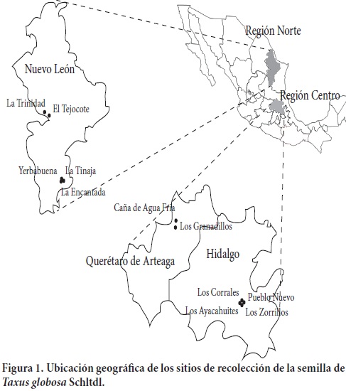 La semilla se recolectó en 11 localidades, cinco de ellas en el Estado de Nuevo León, región norte, y seis en los Estados de Hidalgo y Querétaro, región centro (Cuadro 1, Figura 1). La semilla se obtuvo directamente de la copa de los árboles durante septiembre a noviembre de 2007, cuando el arilo tenía un color rojo. Las semillas colectadas fueron empaquetadas y rotuladas con datos de sitio y fecha. Se hicieron lotes masales al agrupar la semilla por región. En muestras de semillas completas tomadas al azar se hizo la evaluación morfológica de semillas con y sin arilo; en semillas sin arilo también se hizo una caracterización física y un análisis anatómico.