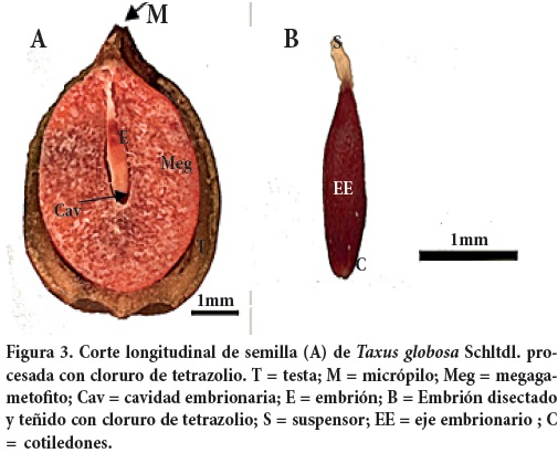 La función primordial de la semilla en cualquier especie es producir nuevos individuos. La variación en el tamaño de la semilla se considera importante porque puede proporcionar a la plántula la habilidad para establecerse en un mosaico de micrositios con condiciones bióticas y abióticas diversas (Bonfil, 1998). Se ha reportado que la semilla de T. globosa presenta latencia (Zavala, 2001; Shemluck et al., 2003), característica que según Bewley y Black (1994) puede ser de origen mecánico, fisiológico o morfológico. Según MasaAki et al. (2007), el conocimiento de la anatomía de la semilla de cualquier especie puede proporcionar información sobre las causas de la latencia y cómo eliminarla. Si bien en otras especies del género Taxus se han encontrado embriones inmaduros (Forbis et al., 2002), en T. globosa no se han hecho estudios anatómicos que confirmen dicha aseveración, y la descripción disponible de la anatomía de su semilla es muy general. En poblaciones de la región de Mineral del Chico, Hidalgo, Zavala (2002) midió el peso de la semilla en diferentes grados de madurez.