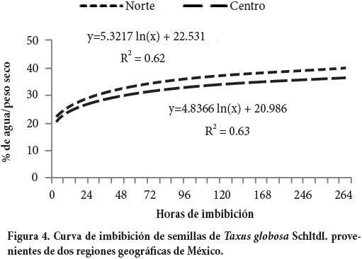 El papel de la testa es fundamental en la incorporación de agua por la semilla; ésta y su permeabilidad están relacionadas con el intercambio gaseoso (Bewley y Black, 1994). El efecto de la testa sobre el embrión puede ser químico por ejemplo, por la presencia de inhibidores fenólicos o mecánico al impedir el flujo necesario de agua y oxígeno para la germinación (Moreno et al., 2006). De acuerdo con la curva de imbibición obtenida, a partir de las 24 h aumentó la entrada de agua, lo que permite deducir que la testa de Taxus globosa no impide la absorción de agua. Por ello, la latencia de la semilla reportada por Nicholson y Munn (2003) probablemente se deba a que el embrión está subdesarrollado o inmaduro.
