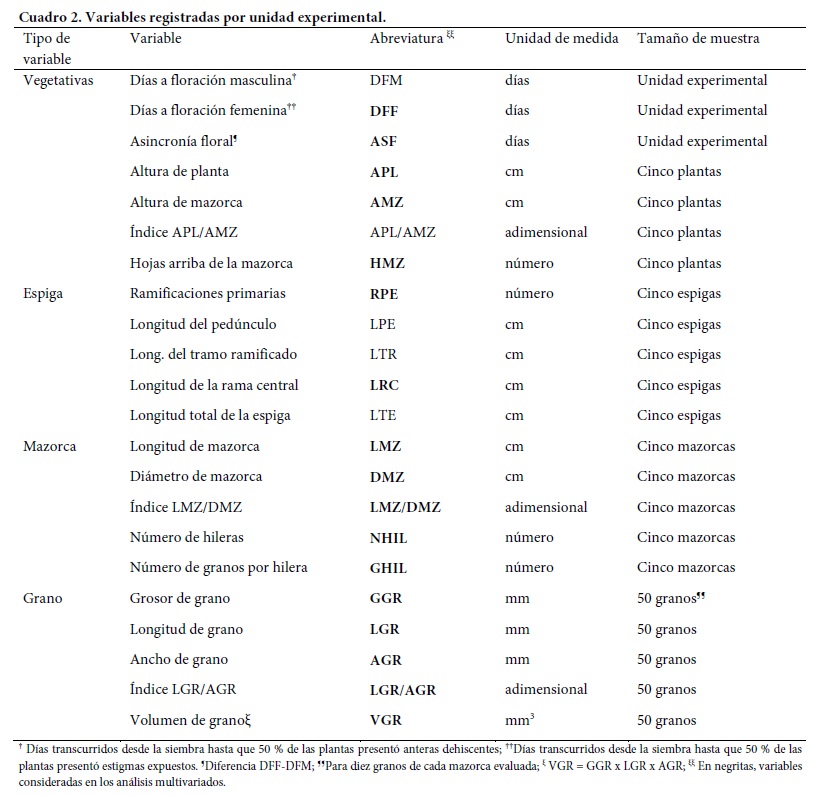Se utilizó un diseño experimental látice 12x12 (Martínez, 1989) con dos repeticiones por localidad. La unidad experimental estuvo constituida por dos surcos de 5 m de largo, con separación de 0.85 m. En cada surco se sembraron tres semillas cada 0.50 m, para después de seis semanas ajustar a dos plantas por punto y obtener una densidad de población de 47 mil plantas por hectárea. Como recomendaron López et al. (2005), en cada parcela se marcaron cinco plantas con competencia completa en la etapa de 10 hojas liguladas, las cuales se utilizaron para obtener la información de las variables reportadas en el Cuadro 2, con excepción de la floración masculina y femenina, así como la asincronía floral, que se obtuvieron de la unidad experimental completa. Al concluir la antesis se tomaron las cinco espigas de las plantas marcadas para registrar las variables sugeridas por Sánchez et al. (1993). A la cosecha se tomaron las mazorcas de las plantas marcadas para recabar la información de mazorca y grano sugerida por Mijangos et al. (2007).