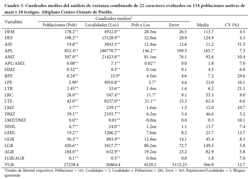 Aun cuando las poblaciones de maíz estudiadas provinieron de localidades relativamente cercanas, la fuente de variación "Poblaciones" presentó diferencias significativas (P ≤ 0.01) para todas las variables, excepto para longitud del pedúnculo de la espiga (Cuadro 3). Ello denota la existencia de variabilidad genética (expresada como diversidad fenotípica) entre poblaciones nativas, testigos y sus efectos confundidos, y en el caso de las primeras constituye un indicio de que se trata de variantes genotípicas, que según Muñoz (2005) y Gil et al. (2004) han sido cultivadas y seleccionadas por los agricultores en respuesta a la variación ambiental y a los usos del cultivo.