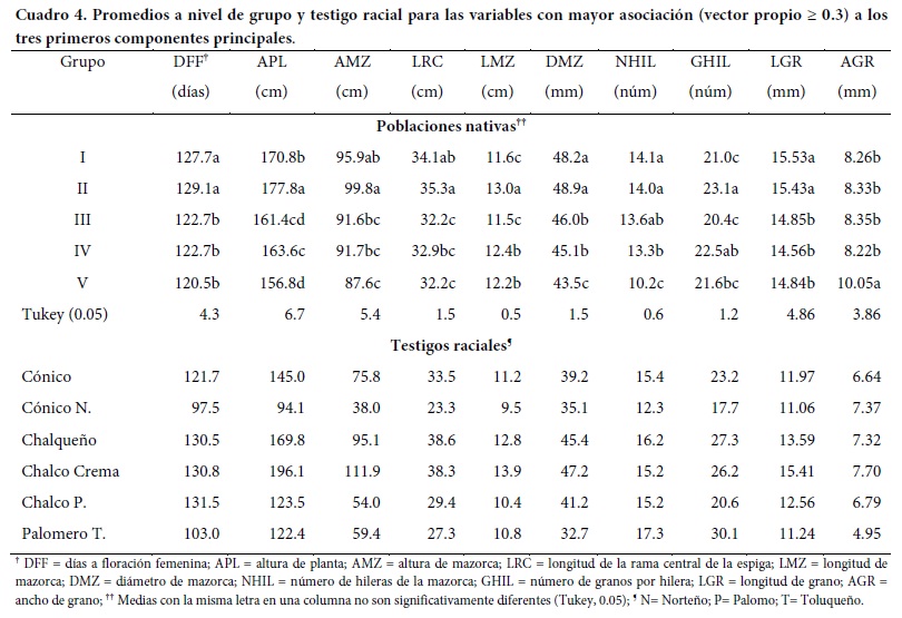 Los Grupos III y IV tuvieron plantas menos vigorosas que las de los Grupos anteriores, lo cual puede atribuirse en parte a que incluyeron una mayor proporción de poblaciones de grano pigmentado (50 % en el Grupo III y 64 % en el IV), las cuales cuando se comparan con las de grano blanco usualmente resultan ser de menores dimensiones (Hortelano et al., 2008). Las características distintivas de los Grupos III y IV fueron que el primero presentó el valor más bajo de longitud de mazorca entre todas las poblaciones nativas, en tanto que el segundo lo tuvo en la longitud de grano (Cuadro 4).