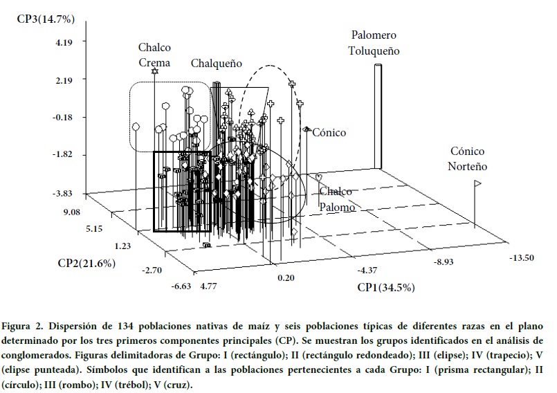 Al sobreponer en la figura de dispersión de las poblaciones (Figura 2) a los grupos identificados en el dendrograma (Figura 1), se observó que los materiales nativos mantuvieron el patrón de agrupamiento precisado a través del análisis de conglomerados. También fue evidente la poca asociación de testigos raciales como Cónico, Cónico Norteño y Palomero Toluqueño (Figura 2), que si bien pertenecen al mismo complejo racial que Chalqueño, en este caso no se integraron a algún conjunto de poblaciones nativas; una situación similar ocurrió para la variante Chalco Palomo. De todos los testigos raciales, Chalqueño y Chalco Crema fueron los más próximos a los grupos formados, particularmente al grupo II (Figura 2). Es de resaltar lo peculiar del Grupo V, el cual se encontró relativamente alejado de los demás conjuntos que formaron las poblaciones nativas, y se mantuvo diametralmente opuesto a todos los testigos raciales, lo que confirma que se trata de un conjunto con rasgos distintivos (Cuadro 4), comparado con el resto de materiales estudiados.