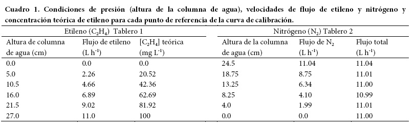 En el Cuadro 1 se muestran las condiciones de presión (altura de columna de agua) con las que se logró cada dilución o punto de referencia de las curvas, la velocidadde flujo de ambos gases y el flujo total de la mezcla, así como la concentración teórica de etileno correspondiente.