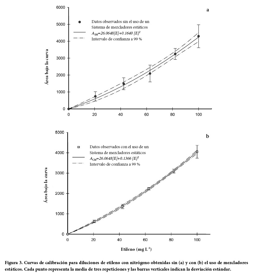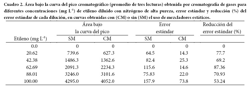 Estas ecuaciones carecen de ordenada al origen, lo que significa que si la concentración de etileno fuera cero el área bajo la curva también sería cero. Este hecho corresponde a lo observado experimentalmente. Los coeficientes de regresión mostraron valores altos en ambos casos; sin embargo, cuando se empleó el sistema de mezcladores estáticos la R2 fue mayor (0.999) en comparación a la obtenida sin el uso de dicho sistema (0.986). Adicionalmente, cuando se empleó el sistema de mezcladores estáticos se observó una reducción en el error estándar para cada punto de referencia. Esta reducción osciló desde 53.2 % hasta 87.4 % (Cuadro 2). Estos resultados ponen en evidencia la mejora de la eficiencia del proceso de mezclado de gases con el uso del sistema de mezcladores estáticos, atribuible a los cambios de dirección de los flujos gaseosos en los mezcladores que incrementaron la turbulencia y favorecieron los procesos de transferencia de masa en el seno del fluido gaseoso, para dar como resultado una mezcla de gases más homogénea.