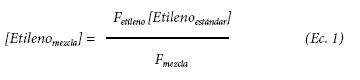 [Etilenomezcla] es la concentración de etileno de la mezcla [mg L"1]; [Etilenoestándar] es la concentración de etileno gas estándar [mg L"1]; Fmezcla es el flujo volumétrico (total) de la mezcla (L h"1); y Fetileno es el flujo volumétrico de etileno (gas estándar) (L h"1).