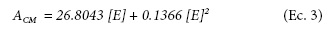 Al considerar la concentración de etileno como la variable independiente y el área promedio bajo la curva del pico como la variable dependiente, se generaron las ecuaciones 2 y 3. Éstas ecuaciones representan el comportamiento del área bajo la curva del cromatograma generado por la concentración de etileno, sin utilizar mezcladores estáticos (ASM) y cuando éstos se emplean (ACM). En la práctica se evalúa el área bajo la curva del pico cromatográfico generado por una concentración desconocida del gas de interés (etileno, en este caso), por lo cual es necesario despejar de la ecuación la concentración del etileno ([E]):