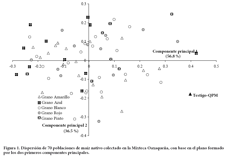 Las diferencias entre grupos de color de grano y poblaciones dentro de grupos se evaluaron mediante un análisis de varianza con un modelo lineal de bloques completos al azar y una prueba de comparación de medias de Tukey (P ≤ 0.05). Con los promedios estandarizados por muestra se hizo un análisis de componentes principales para describir los patrones poblacionales con referencia al testigo QPM, todo ello mediante el paquete estadístico SAS versión 8.0 (SAS Institute, 1999).