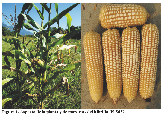 El 'H-563' tiene hojas semihorizontales de color verde oscuro. Su floración masculina en el ciclo agrícola P-V ocurre a los 61 dds, y 2 d después es la femenina. Su planta tiene una altura promedio de 257 cm y a la mazorca de 116 cm. Su espiga es semiabierta con 11 a 17 ramas laterales primarias, y sus estigmas son de color rosa con fondo verde claro. Su mazorca es gruesa y cilíndrica, de 17 a 20 cm de longitud y con excelente cobertura por las brácteas, de tamaño medio con 16 a 18 hileras rectas y 34 a 40 granos por hilera. Su grano es de color blanco con textura semicristalina (Figura 1).