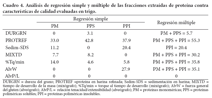 Mediante análisis de regresión se estimó el porcentaje de explicación atribuible a las fracciones de proteína sobre características de calidad del trigo. La regresión simple mostró que las PM explican 14.0 % del torque (%Tq/min) y las PPI el 20.4 % en volumen de sedimentación (Sedim-SDS) y 27.9 % de fuerza general de gluten (AlvW) (Cuadro 4). Estos resultados muestran una mayor influencia de las PPI que las PM, en la explicación y predicción de la calidad. Sin embargo, el análisis acumulativo destaca la acción combinada de las tres fracciones de proteína al explicar 30.2 %, 35.8 % y 35.1 % de tiempo de desarrollo de la masa (MIXTD), %Tq/ min y AlvW, respectivamente; este tipo de análisis resulta muy útil en la elaboración de modelos matemáticos para la predicción de variables o parámetros reológicos de calidad.