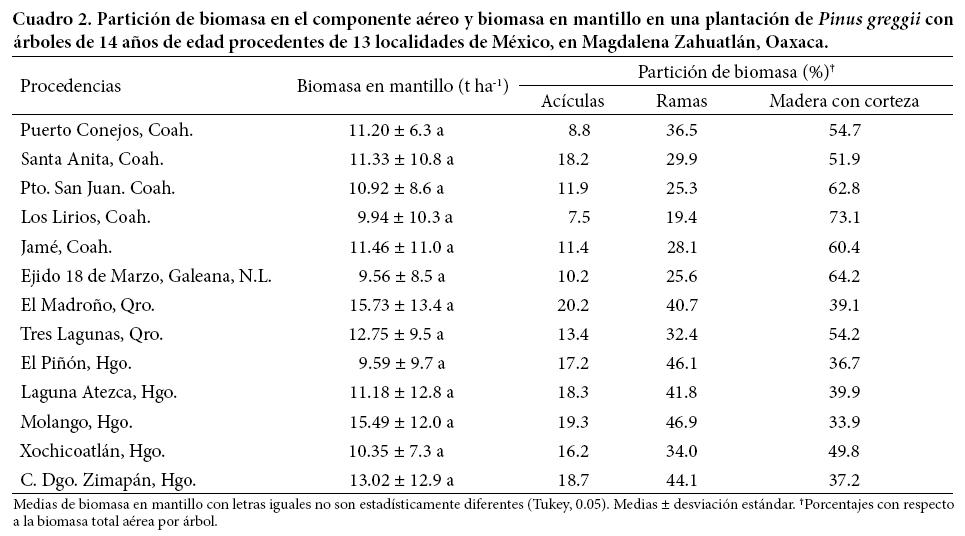Las acumulación de biomasa en acículas fue mayor de 5 t ha-1 en las procedencias de Pinus greggii del centro de México (El Piñón y Molango, Hidalgo), en comparación con las procedencias del norte. La biomasa de ramas fue similar entre procedencias, con un promedio de 9.5 t ha-1. La biomasa en madera con corteza de las procedencias del norte del país (Los Lirios, Coahuila y Ejido 18 de Marzo, N.L.) con 19.4 y 17.0 t ha-1 respectivamente, fue superior a la biomasa de este componente en las procedencias del centro de México (Laguna Atezca, El Madroño, Molango y Comunidad Durango) cuya biomasa fluctuó entre 8.8 y 9.5 t ha-1.