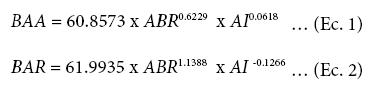 donde: BAA = biomasa de acículas (kg), BAR = biomasa de ramas (kg), ABR = área basal de rama (cm), AI = altura de inserción (m). Las bondades de ajuste (R2) fueron de 0.88 y 0.89, para las Ecs. 1 y 2 respectivamente.