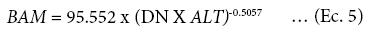 donde: BAM = biomasa acumulada en madera (kg), DN = diámetro normal (cm), ALT = altura total (m). El ajuste alcanzado fue de R2 = 0.88, CV = 91.3 % y CME = 134.0, P < 0.0001.