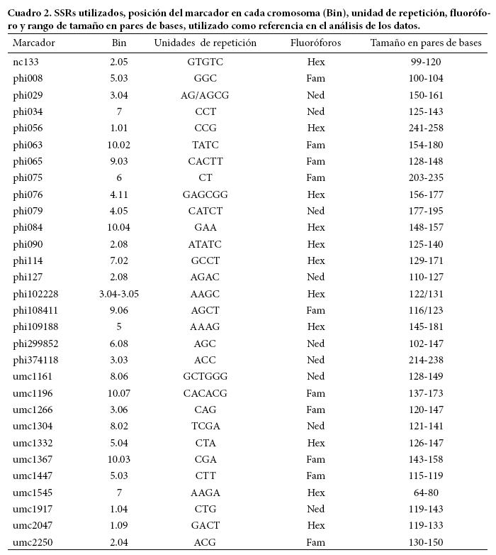 Se usaron 15 plantas elegidas al azar de cada accesión para hacer una muestra compuesta de ADN ("bulk"). Se cosecharon hojas frescas y sanas de plantas de alrededor de 30 d de edad. El tejido vegetal se congeló a -80 °C, luego se liofilizó y se molió finamente para la extracción de ADN bajo el método de CTAB (CIMMYT, 2006). El ADN se cuantificó con el espectrofotómetro NanoDrop® (Thermo Scientific, Wilmington, DE) y se realizó la reacción en cadena de la polimerasa (PCR, por sus siglas en inglés) de acuerdo con el protocolo estandarizado por CIMMYT cuando se utiliza un secuenciador automático de ADN para el análisis de fragmentos (CIMMYT, 2006). Se utilizaron 30 marcadores SSR (Cuadro 2) de la base de datos genéticos y genómicos para maíz dsiponible en línea (Maize Genetics and Genomics Database; http://www.maizegdb.org/).
