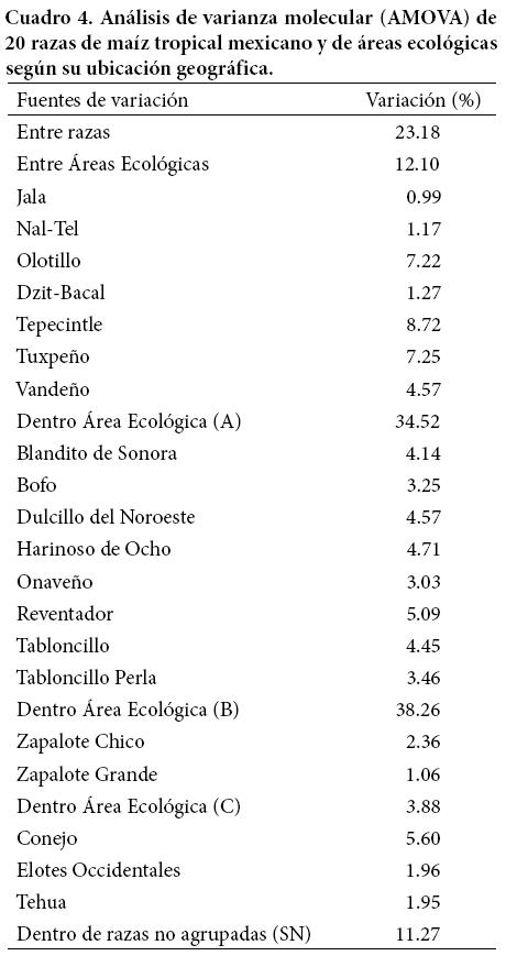 De esta manera se encontró mayor variabilidad entre razas (23.18) que dentro de cada raza (máximo 8.72 y mínimo 0.99) (Cuadro 4). El área ecológica B presentó el mayor porcentaje de variación (38.23 %), lo que sugiere una gran variabilidad genética que se puede explorar ampliamente. El menor porcentaje se encontró dentro del área ecológica C, con 3.88 %. Esto confirma resultados anteriores, en el sentido de que a mayor número de razas y más amplia su distribución geográfica, mayor es la variación dentro del grupo. Así se ratifica que la limitada distribución geográfica de los Zapalotes haya conducido a un porcentaje de variación muy bajo. Por otro lado, las razas no agrupadas indican una diversidad genética que no está presente en los tres grupos definidos previamente, según sus áreas ecológicas.