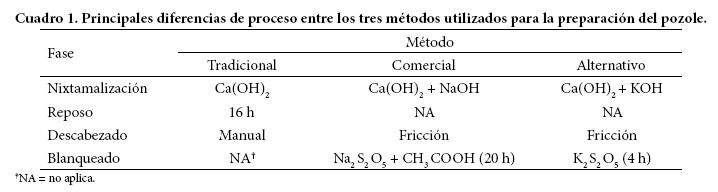Se utilizaron tres métodos para la preparación del pozole (grano floreado): el método tradicional, el método comercial, y un tercero denominado "alternativo" (Cuadro 1).