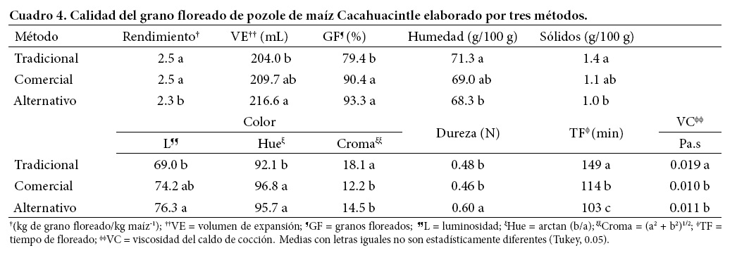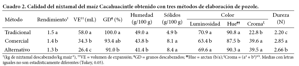 La calidad del pozole del maíz Cacahuacintle evaluada por los tres métodos (tradicional, comercial, alternativo) fue expresada por variables de tres fases del proceso de elaboración: nixtamal, grano precocido (blanqueado) y grano floreado (Cuadros 2, 3 y 4). Se encontraron diferencias significativas en todas las variables evaluadas, excepto en rendimiento, humedad y ángulo de tono "hue" en grano blanqueado.