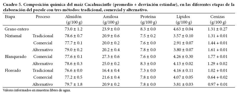 El contenido de almidón en el nixtamal, expresado en base seca, presentó un aumento con respecto al grano entero, como resultado de la pérdida de otras estructuras del grano, como pericarpio y pedicelo, durante la nixtamalización. Mientras que en el grano blanqueado hubo una ligera disminución, que refleja una pérdida de almidón en la solución de blanqueo, como resultado del tiempo que dura este proceso. En el floreado el contenido de almidón disminuyó a medida que aumentó el tiempo de cocción (Cuadro 5).