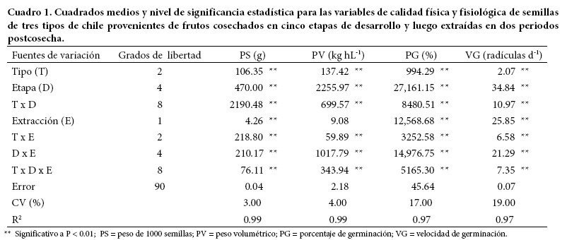 Las fuentes de variación resultaron significativas en todas las variables, excepto el efecto de la extracción (E) sobre el peso volumétrico (PV) (Cuadro 1). Esto último indica que las etapas de extracción no indujeron cambios en el peso volumétrico de las semillas; es decir, que el PV fue el mismo, ya sea que hayan sido extraídas inmediatamente después de cosechar el fruto o después de haberlas dejado secar por 15 d. Los resultados del análisis de varianza también muestran el efecto del factor etapa de desarrollo (D) sobre las variables peso volumétrico, germinación y velocidad de germinación; en el peso de 1000 semillas el efecto de dicho factor fue superado por su interacción con el tipo de chile (T x D), como se demuestra al comparar el valor relativo de los cuadrados medios de cada fuente de variación (Cuadro 1).