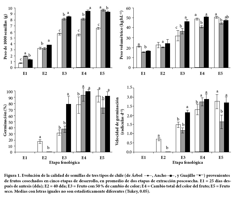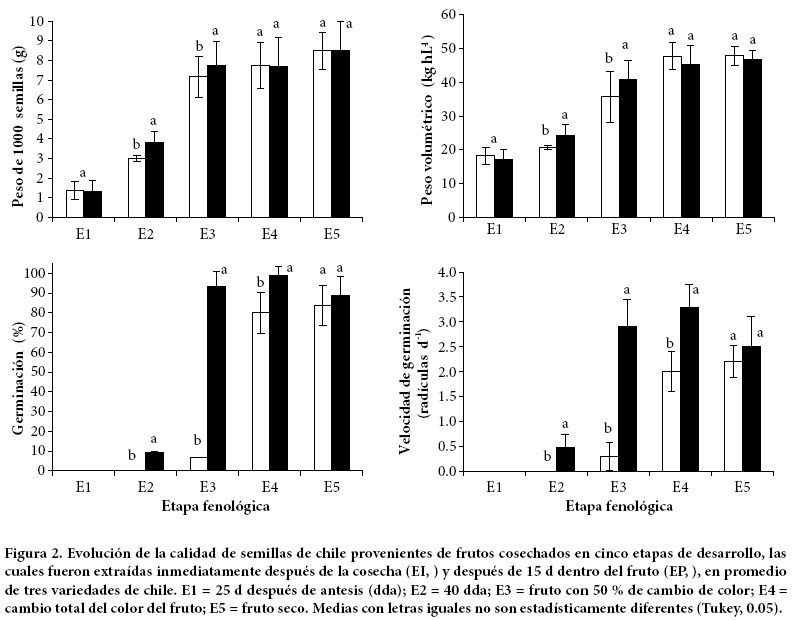 En los tres tipos de chile, la calidad fisiológica (PG y VG) alcanzó su máximo cuando las semillas se cosecharon durante la madurez del fruto (E4), con una sola excepción (Figura 1). La máxima calidad en chiles Ancho y Guajillo se obtuvo en esta etapa y se mantuvo durante E5 sólo para Guajillo, mientras que en chile de Árbol la máxima se alcanzó hasta E5 (Figura 1). Resultados similares fueron reportados por Sayed y Essam (1952), Edwards y Sundstrom (1987) y Valdés et al. (1992) en chile Bell.