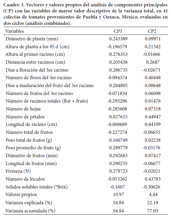 Los dos primeros componentes principales explicaron 77.03 % de la variación total, con 54.84 % y 22.19 %, respectivamente (Cuadro 3). Las variables incluidas en el CP1 fueron diámetro de planta, altura al primer racimo, días a floración, días a maduración del tercer racimo, número de frutos del tercer racimo, número de racimos totales, número de hojas, número total de frutos, peso promedio de fruto, y diámetro, longitud y firmeza del fruto. El CP2 estuvo compuesto por las variables número de flores del tercer racimo (NFlR3), número de pétalos, longitud del racimo, y número de lóculos.
