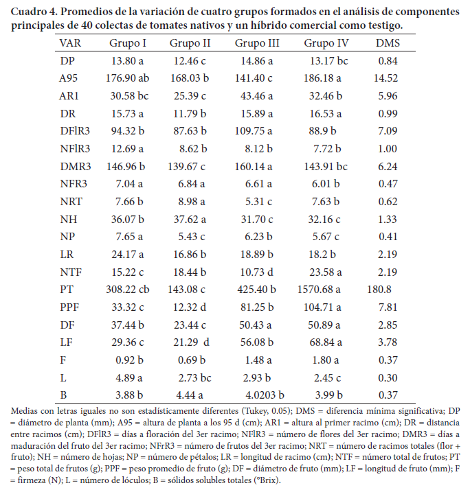 En resumen, el Grupo II mostró los valores más altos en sólidos solubles totales, y el Grupo III sobresalió en rendimiento y tamaño del fruto, así como en firmeza. Según Ramos et al. (2010), esta última característica se considera importante para la comercialización en fresco del tomate. Los materiales experimentales superaron el umbral mínimo para comercialización, que es de 1.45 N (Batu, 2004). Esto indica que estos materiales tienen potencial para su comercialización local, o que de ellos se puedan generar líneas con buena firmeza para su uso directo por los productores o para mejoramiento.