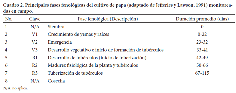 Las fases fenológicas monitoreadas en campo fueron las descritas por Jefferies y Lawson (1991), para relacionar su duración promedio con lo observado en campo y su clave correspondiente, aunque se consideró que la siembra y la cosecha no son fases fenológicas sino que se utilizaron para marcar el inicio y termino del cultivo establecido en campo. Por tanto, las principales fases fenológicas son descritas de acuerdo con sus características para realizar una identificación más clara y precisa (Cuadro 2).