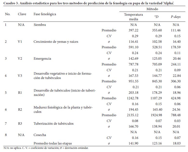 De los tres métodos analizados, el método P-days fue el más preciso en la predicción de las fases fenológicas en el cultivo de la variedad 'Alpha' de papa con base en el tiempo térmico, ya que presentó los valores más pequeños de dispersión, cuyos valores promedio para todas las etapas fenológicas analizadas fueron de 0.07 y de 18.03 para el CV y σ, respectivamente.