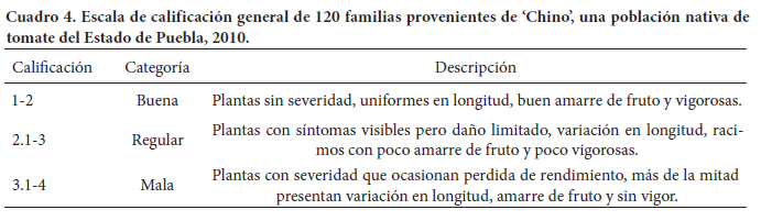Los análisis de varianza mostraron diferencias significativas (P ≤ 0.05) entre las familias en todas las variables. Los mayores coeficientes de variación se obtuvieron en número de racimos con fruto 20 %, severidad general 27 %, uniformidad 24 %, y calificación fenotípica general 30 % (Cuadro 5), valores que indican una amplia variabilidad fenotípica dentro de la población. Resultados similares se obtuvieron en diferentes poblaciones de tomate evaluadas en condiciones de invernadero en el Estado de Oaxaca, que mostraron coeficientes de variación de 26 % en número de frutos por racimo, 12 % en diámetro de tallo, y 8 % en altura de planta (Carrillo y Chávez, 2010; Chávez et al., 2011).