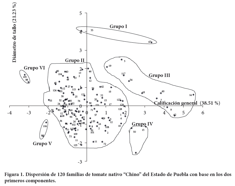 Las familias de tomate provenientes del Estado de Puebla llamadas localmente "chino" se dispersaron en los cuatro cuadrantes como resultado de la amplia variabilidad intrapoblacional existente en la población original, y formaron seis grupos con base en los dos primeros componentes principales (calificación general y diámetro de tallo) (Figura 1). El Grupo I estuvo constituido por las familias 33 y 47 que se ubicaron en los cuadrantes I y IV. La familia 33 presentó mayores valores de diámetro de tallo y altura de planta, y es considerada como de buen fenotipo; y aunque la 47 presentó buen diámetro de tallo y altura de planta, se caracterizó como de fenotipo regular.