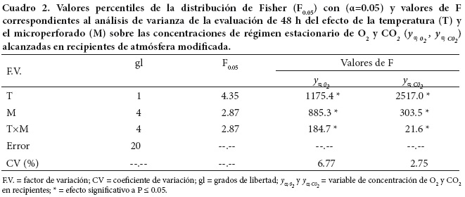 Por otro lado, la suma (y0 + a) coincidió con la asíntota de las curvas de cambio de concentración y correspondió con el valor de concentración alcanzada (y∞) tras la estabilización (Cuadro 1), lo cual fue similar a lo observado por Monroy-Gutiérrez et al. (2013) en sistemas de AM microperforados que se usaron con huitlacoche (Ustilago mayáis; hongos comestibles que crecen en mazorcas de maíz, Zea mays). El análisis de efectos mayores del diseño factorial mostró que este valor y∞, llamado concentración de régimen estacionario, se afectó por la temperatura (Cuadro 2), de forma que para O2 y CO2 tuvo valores promedio de 3.6 y 22.1 % a 18 °C, respectivamente, los cuales fueron distintos (P < 0.05) a los alcanzados a 5 °C (9.0 y 13.2 %), con diferencias significativas honestas (DSH) de 0.33 y 0.37 %, respectivamente. También hubo efecto significativo del grado de microperforación, aunque el análisis de varianza reportó interacción significativa entre este factor y la temperatura (P < 0.05, Cuadro 2). En ambas condiciones térmicas, cuanto mayor fue el número de perforaciones, mayores y menores (P < 0.05) fueron las concentraciones y∞ alcanzadas por el O2 y el CO2, respectivamente (Cuadro 1), lo cual confirmó lo postulado por Makino et al. (2008), en el sentido que el microperforado constituye una manera efectiva de controlar la concentración de gases en envases de sistemas de AM.
