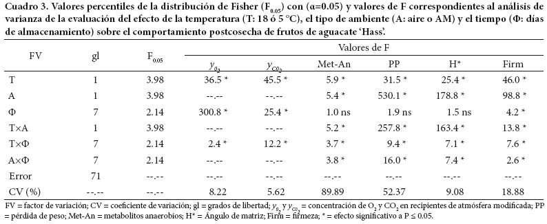 Firmeza. El ablandamiento es el rasgo más característico del proceso de maduración de un fruto de aguacate 'Hass' y se considera un criterio de referencia para evaluar la vida postcosecha potencial (Ochoa-Ascencio et al., 2009). En el presente trabajo la firmeza se afectó por los tres factores evaluados (T, A y Φ), entre los cuales hubo interacción significativa (P < 0.05; Cuadro 3). En todos los casos hubo reducción notable de la firmeza con el tiempo (P < 0.05), con la mayor velocidad de cambio en el manejo en aire a 18 °C, seguida por los manejos de AM a 18 °C, aire a 5 °C y AM a 5 °C, en ese orden, con diferencia significativa entre ellos (Figura 2E).