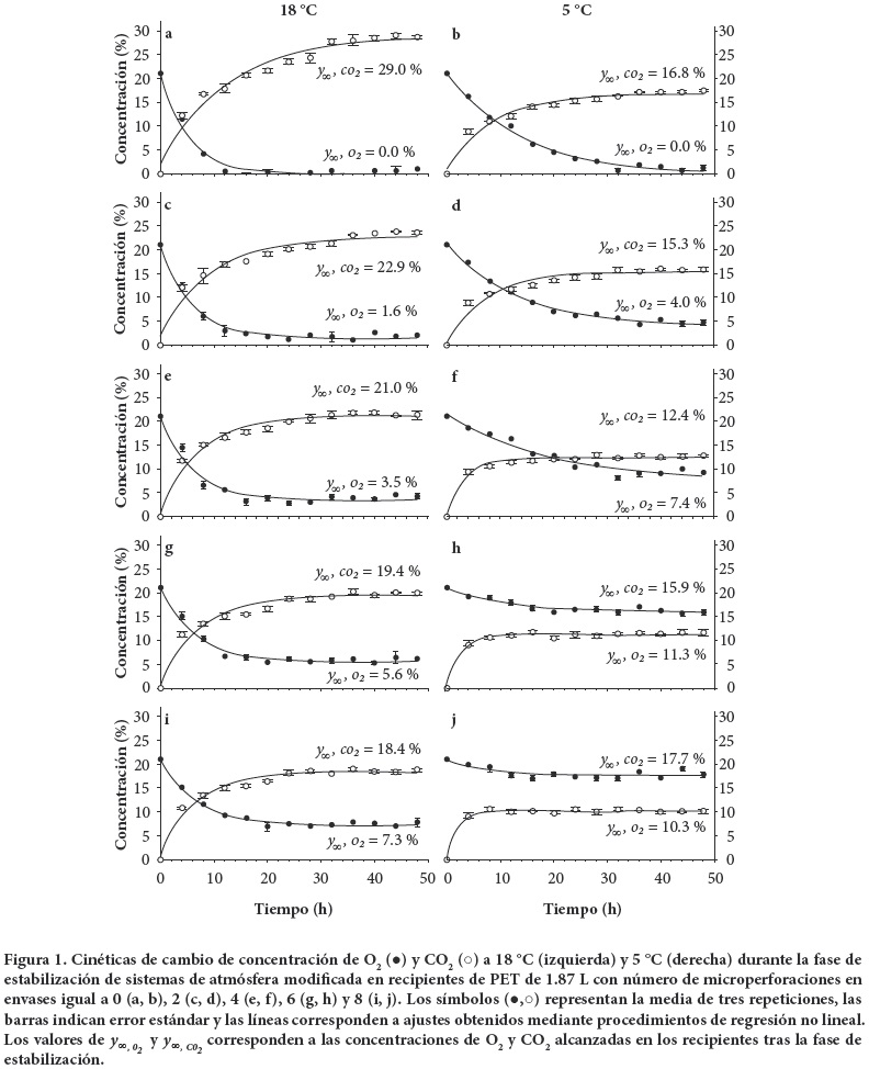 Para las AM se usaron envases de tereftalato de polietileno (PET) de 1.87 L de capacidad. Se formaron cinco lotes de seis envases cada uno, los cuales se nombraron M0, M2, M4, M6 y M8, y contuvieron tres frutos de aguacate con peso total de 550 (± 34.2) g. En los envases de los cuatro últimos lotes se hicieron 2, 4, 6 y 8 microperforaciones de 200 (m, respectivamente, y los de M0 se dejaron sin perforar. Tres envases de cada lote se colocaron a temperatura ambiente (18 ± 2 °C) y los tres restantes a 5 (± 1) °C, donde se permitió acondicionamiento térmico por 5 h antes de ser cerrados. En cada envase se monitoreó la concentración de O2 y CO2 a intervalos de 4 h durante 48 h, con apoyo de un cromatógrafo de gases (Varian Star®, 3400CX, USA) equipado con columna Chrompack Poraplot-Q®, detector por conductividad térmica y detector por ionización de flama, que operó a 80, 150 y 170 °C en la columna, inyector y detectores, respectivamente, con presión manométrica de columna de 158.5 kPa. Con los datos se ajustaron modelos de regresión con la forma [y02/C02 = y0 + a (1-exp(-bt))], donde y02/C02 es concentración (%) de O2 o CO2 al tiempo transcurrido (t, h), y y0 (%), a (%) y b (h-1) son constantes de regresión. Los modelos se usaron para evaluar las concentraciones de O2 y CO2 alcanzadas en condición de régimen estacionario (y∞) y éstas sirvieron para elegir un nivel de microperforado en cada condición térmica para tener concentraciones de O2 sin riesgo de metabolismo fermentativo.