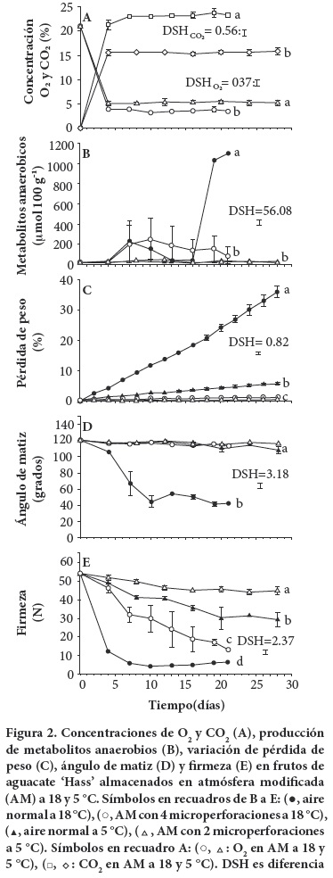 Concentraciones de O2 y CO2. Durante la evaluación de frutos por 21 a 28 d, la concentración de O2 se redujo y la de CO2 se incrementó en los envases de AM en los primeros 5 d (Figura 2A) y esta modificación fue significativa (P < 0.05; Cuadro 3). También hubo efecto notorio de la temperatura, de manera que el O2 se equilibró con 3.53 % (± 0.50 %) a 18 °C y con 5.26 % (± 0.67 %) a 5 °C (DSH = 0.37 %), en tanto que el CO2 se estabilizó en 23.22 % (± 0.93 %) a 18 °C y en 15.58 % (± 0.69 %) a 5 °C (DSH = 0.56 %) (Figura 2A). Estos valores fueron similares a los que se predijeron en la primera fase del trabajo y ello confirmó que con 4 y 2 microperforaciones a 18 y 5 °C, respectivamente, se logra que el O2 se equilibre con más de 2 %, que es la tolerancia del fruto a bajo nivel de O2 (Hertog et al., 2003).