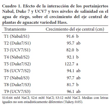 Los resultados obtenidos en algunas variables evaluadas fueron producto del efecto independiente de los factores en estudio, mientras que en otros hubo efecto de la interacción entre ellos. El desarrollo del eje central fue afectado por la interacción entre la variedad del portainjerto y los niveles de salinidad. Las plantas que alcanzaron el mayor desarrollo fueron las del tratamiento T5 (Duke7/S2), que superaron a los tratamientos T1 (Nabal/S1), T3 (UCV7/ S1), T4 (Nabal/S2) y T8 (Duke7/S3) (Cuadro 1). Se observó en general mayor crecimiento del eje central a medida que aumentó la concentración de NaCl, con excepción de las plantas del tratamiento T8 (Duke7/S3), las que alcanzaron el menor desarrollo.