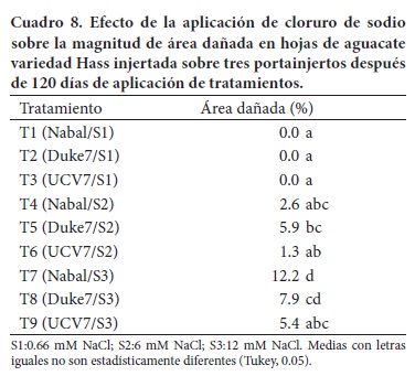 La necrosis de hojas causada por acumulación de sales se debió a la interacción de los factores en estudio. Las plantas que presentaron síntomas de mayor daño correspondieron al tratamiento T7 (Nabal/S3) y T8 (Duke7/S3) que alcanzaron el nivel "daño severo" en la escala definida (Cuadro 8). El resto de los tratamientos presentó un daño foliar significativamente menor a los indicados. En aguacate se ha comprobado que altos niveles de Cl provocan necrosis en hojas, y el nivel de daño de este elemento estaría relacionado con su concentración en los tejidos, lo que a su vez estaría regulado por la variedad afectada (Mickelbart y Arpaia, 2002; Mickelbart et al., 2007).