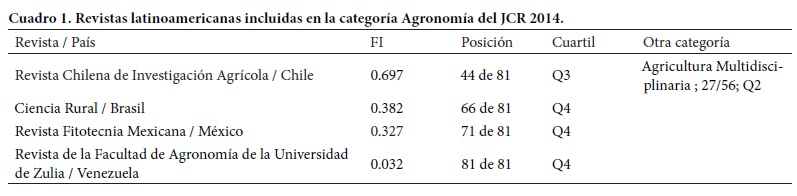 En la categoría Agronomía del JCR la RFM tiene la posición 71 de 81 revistas, que corresponde al Q4. El promedio del FI 2014 de las revistas en esta categoría es 1.264. Arriba de este promedio hay 30 revistas (37 %). El FI más alto (4.882), y por tanto la posición 1 de 81, corresponde a la revista Global Change Biology Bioenergy, de Inglaterra, editada por Springer. Entre las 51 revistas (63 %) que se encuentran abajo del promedio se encuentra la RFM (FI 0.327). Para subir de cuartil, la RFM necesita crecer su FI a una tasa más alta que la observada en 2014 (10.8 %), y superar el FI promedio en la categoría JCR Agronomía (1.264). En la categoría Agronomía se encuentran otras tres revistas Latinoamericanas: Revista Chilena de Investigación Agrícola, Ciencia Rural, y la Revista de la Facultad de Agronomía de la Universidad de Zulia (Cuadro 1). Tres revistas están colocadas en el Q4, mientras que la Revista Chilena de Investigación Agrícola se encuentra posicionada en el Q3; esta última revista también está listada en la categoría Agricultura multidisciplinaria, en el cuartil Q2.
