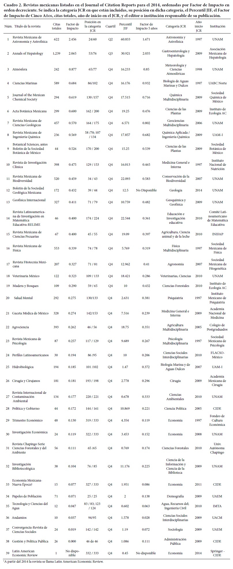 En América Latina los países con más revistas JCR 2014 son Brasil (119), México (38), Chile (35), Argentina (19), Colombia (15) y Venezuela (8). Todas las revistas mexicanas aparecen en el Cuadro 2, ordenadas por FI en orden decreciente; también se indica la categoría JCR en que están incluidas, su posición en dicha categoría, Factor de Impacto de cinco años, citas totales, año de inicio en el JCR, y el editor o institución responsable de su publicación. Además se incluye el Percentil Journal Impact Factor (Percentil JIF), medida que realiza el editor del JCR para transformar la posición por FI en un valor percentil, lo que permite una comparación más significativa en la categoría (Thomson Reuters s.f. b).