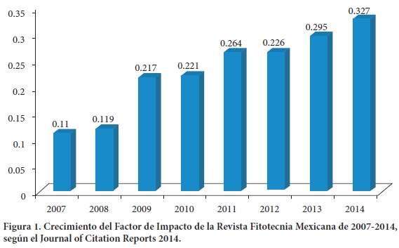 La Revista Fitotecnia Mexicana muestra crecimiento en su FI a través de los años, el cual necesita aumentar para subir de cuartil y superar el FI promedio en la categoría JCR Agronomía. Son 20 (52.63 %) las revistas JCR mexicanas que fueron aceptadas en el Science Citation Index y Social Sciences Citation Index entre los años 2000 a 2009, aunque las aceptadas en la década actual (2010) puede superar dicho número, de acuerdo al número aceptado hasta 2014 (10 revistas).