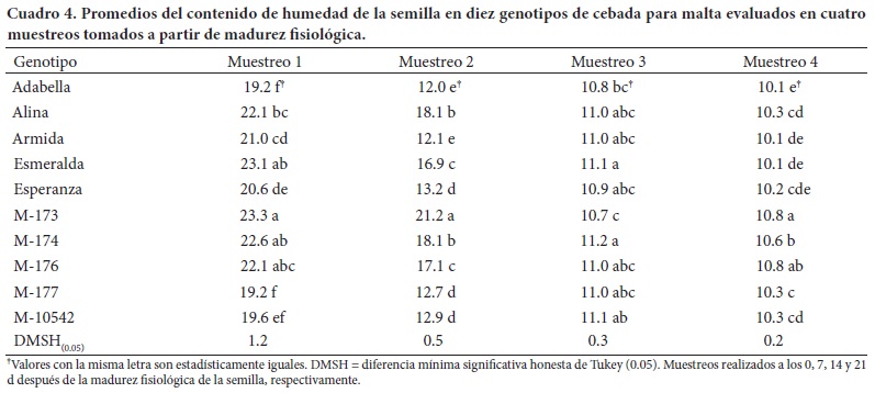 En el análisis de varianza solo se evaluaron los primeros cuatro muestreos, debido a que la mayoría de genotipos alcanzó más de 90 % de germinación en ese lapso, con excepción de los genotipos Alina, Armida y M-173 que requirieron de 28 d, para alcanzar ese porcentaje. Alina y Armida fueron los únicos genotipos que mostraron menos de 50 % de germinación en madurez fisiológica, pero a medida que el muestreo se hizo más tarde su porcentaje de germinación aumentó, al igual que en los demás genotipos; aun así, el comportamiento de la germinación fue diferente entre genotipos (Cuadro 1). Las semillas de cebada recién cosechadas exhiben baja germinación atribuido en gran medida a que las cubiertas del grano (lema y palea) reducen la disponibilidad de oxígeno al embrión; no obstante, después de alcanzar la madurez fisiológica aumenta la permeabilidad de la cubierta de la semilla, lo que contribuye a la mejora de la capacidad de germinación (Bradford et al., 2008).