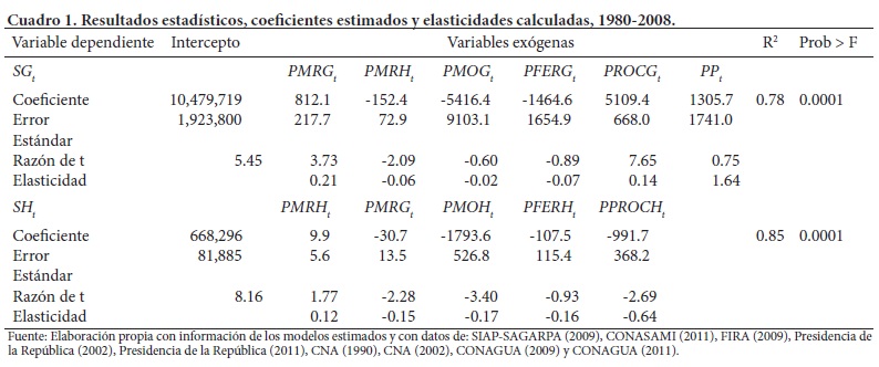 donde: SGt es la superficie de granos en el año t (ha); PPRGt es el precio promedio real de granos en el año t (pesos t-1); PPRHt es el precio promedio real de frutas y hortalizas en el año t (pesos t-1); PPOGt es el precio promedio real de mano de obra para granos en el año t (pesos por día); PFERGt es el precio promedio real del fertilizante para granos en el año t (pesos t-1); PPROCGt es el pago promedio real de PROCAMPO para granos en el año t (pesos t-1); PPt es la precipitación pluvial en el año t (mm); SHt es la superficie de frutas y hortalizas en el año t (ha); PPOHt es el precio promedio real de mano de obra para frutas y hortalizas en el año t (pesos por día); PFERHt es el precio promedio real del fertilizante en el año t (pesos t-1); PPROCHt es el pago promedio real de PROCAMPO para hortalizas en el año t (pesos t-1).